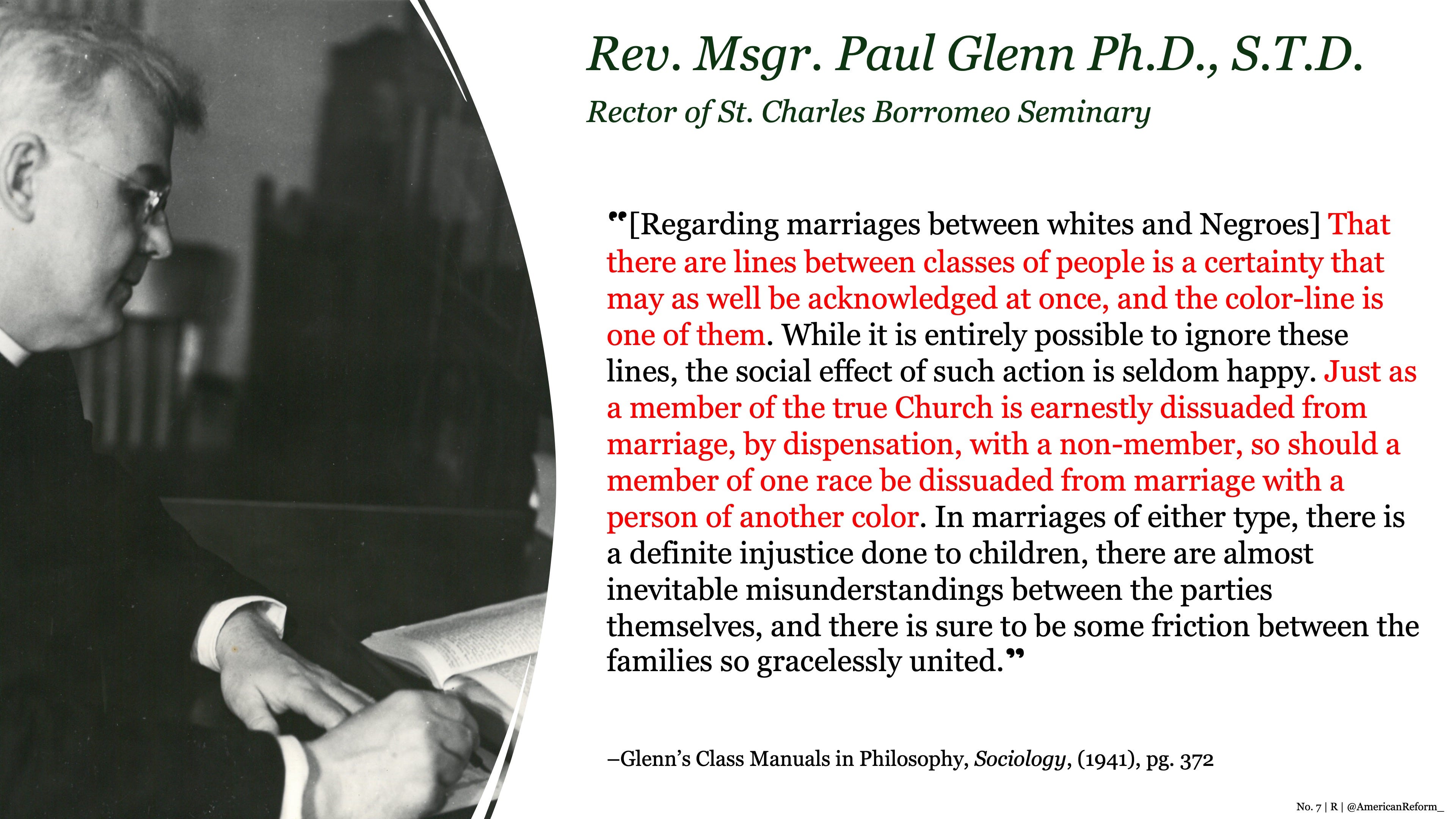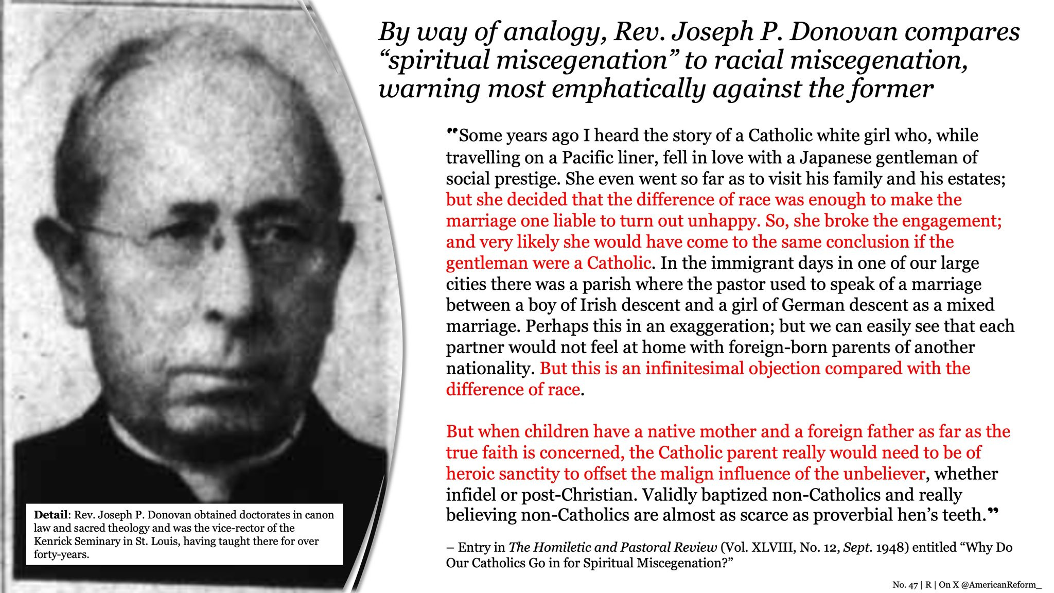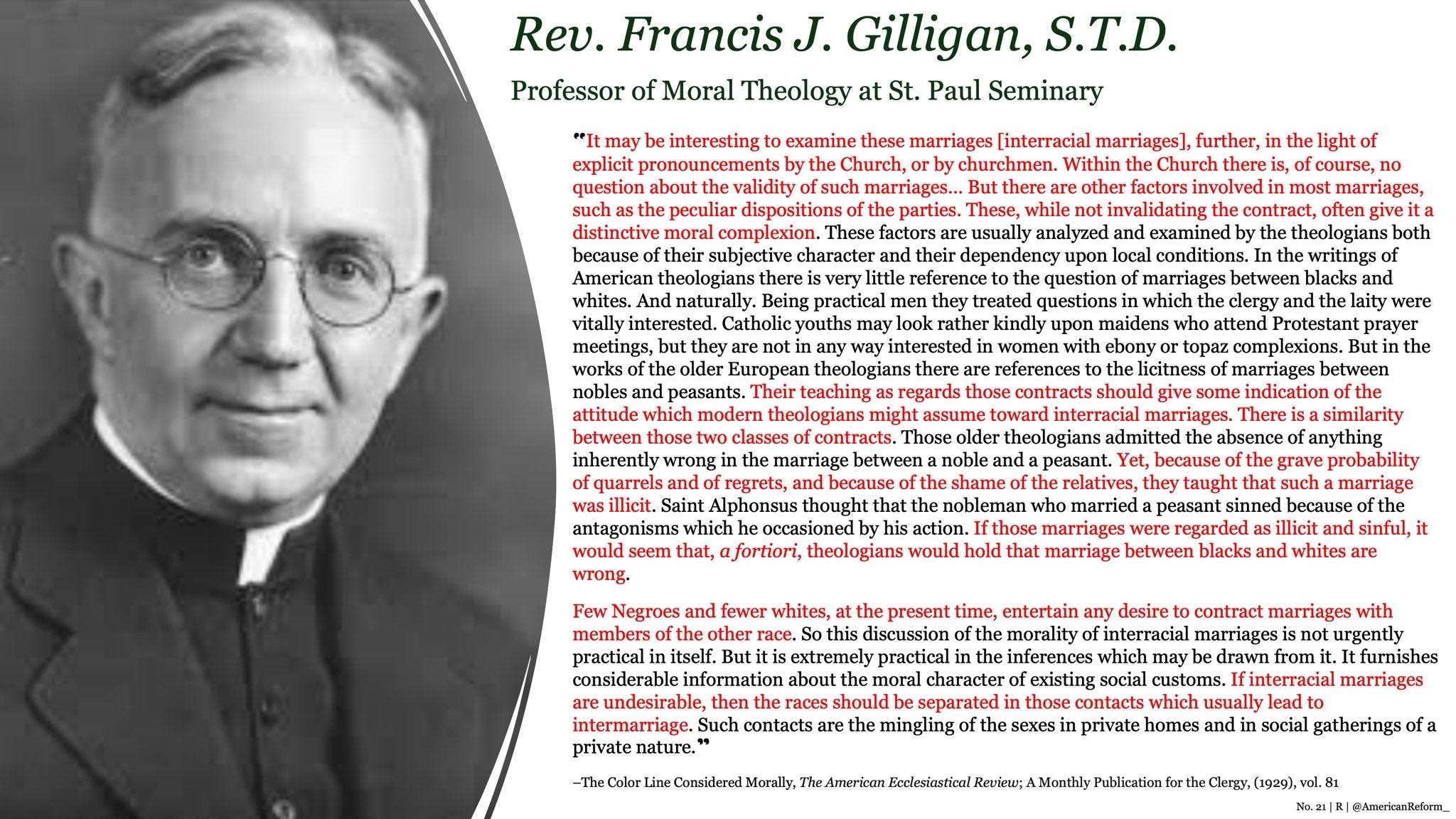 “Like interracial marriage is against his values cuz like that’s not Catholic values. It’s not [against Catholic values], it’s kind of racist and you got to be careful with that. Like St. Paul’s pretty clear. There’s neither Jew nor Gentile or Greek, you know, meaning once we’re incorporated into the body of Christ, those differences, while they’re important for reasons of like cultural cohesion [sic], are secondary to baptism.” — Kennedy Hall, 30:54 mark