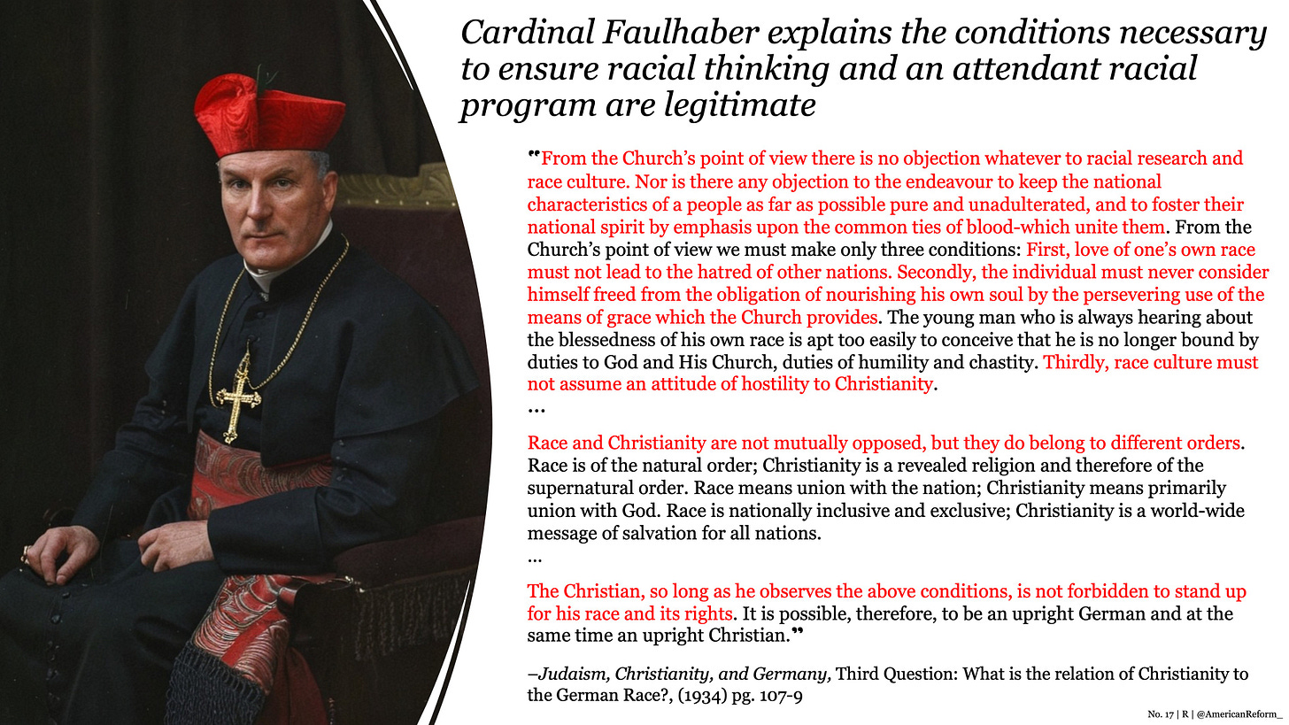Finally, the eminent Cardinal Michael von Faulhaber drove home this same distinction, simultaneously outlining necessary conditions to regulate a program of Catholic racialism in a series of sermons, later collected and published in 1934: