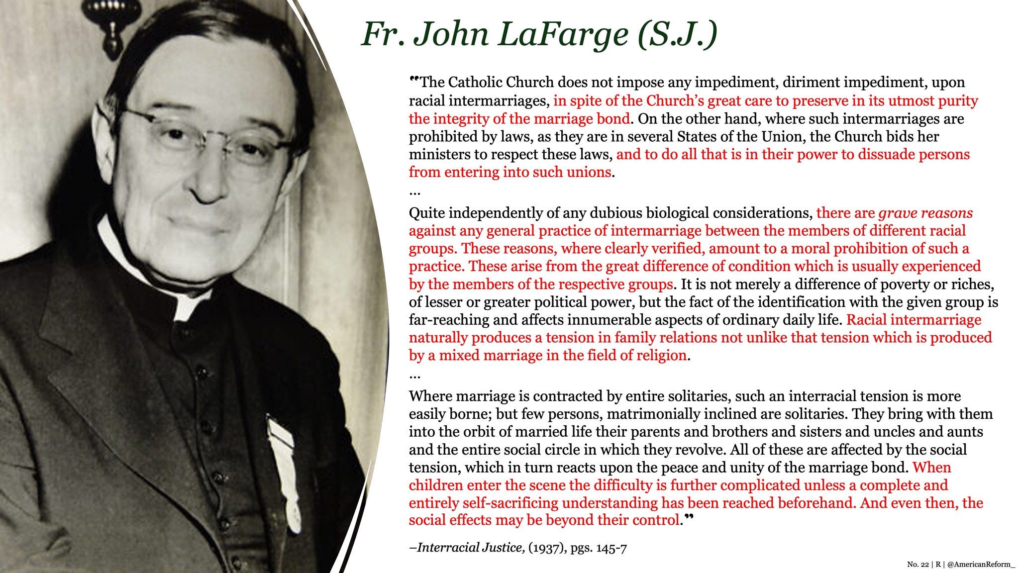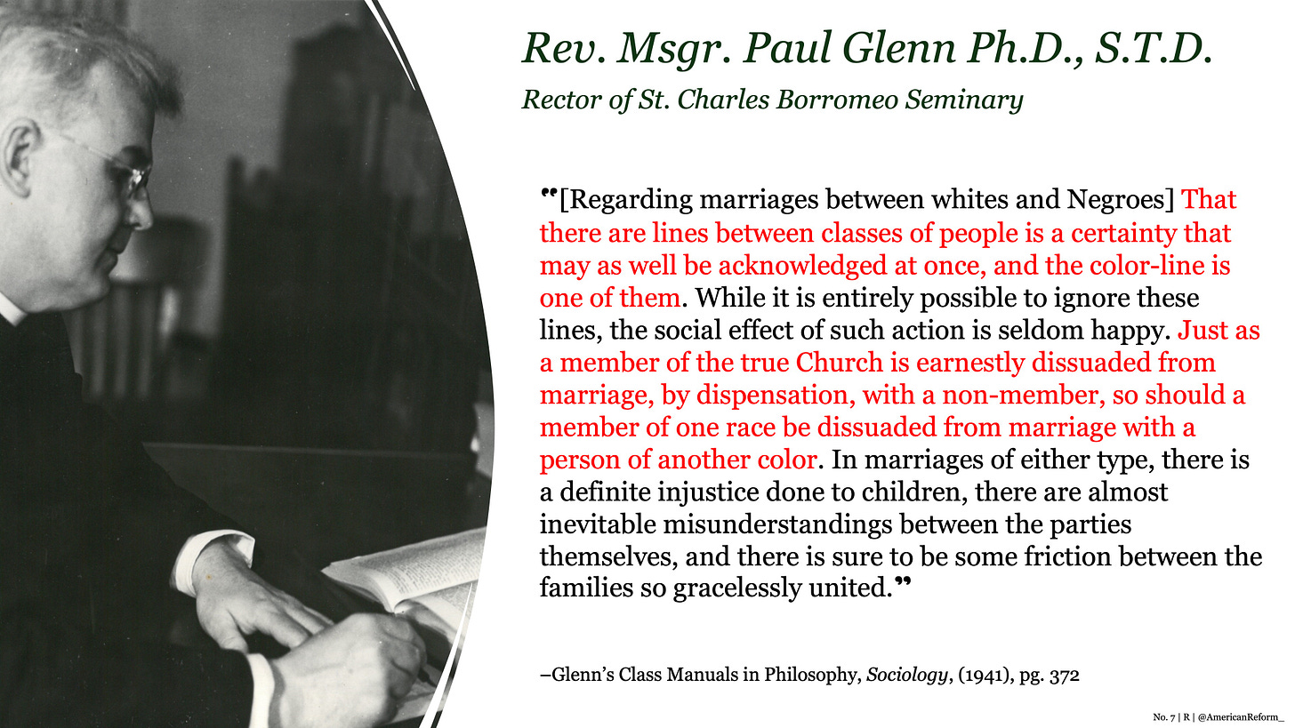 Finally, the general attitudes of Americans towards racial intermarriage are worth examining. As reported by Gallup Polling in 1958, only 4% of Americans approved of racial intermarriage between White and Black people. Presumably some of them were good Catholics, whose views were informed by something other than blind, race-hatred and prejudice?