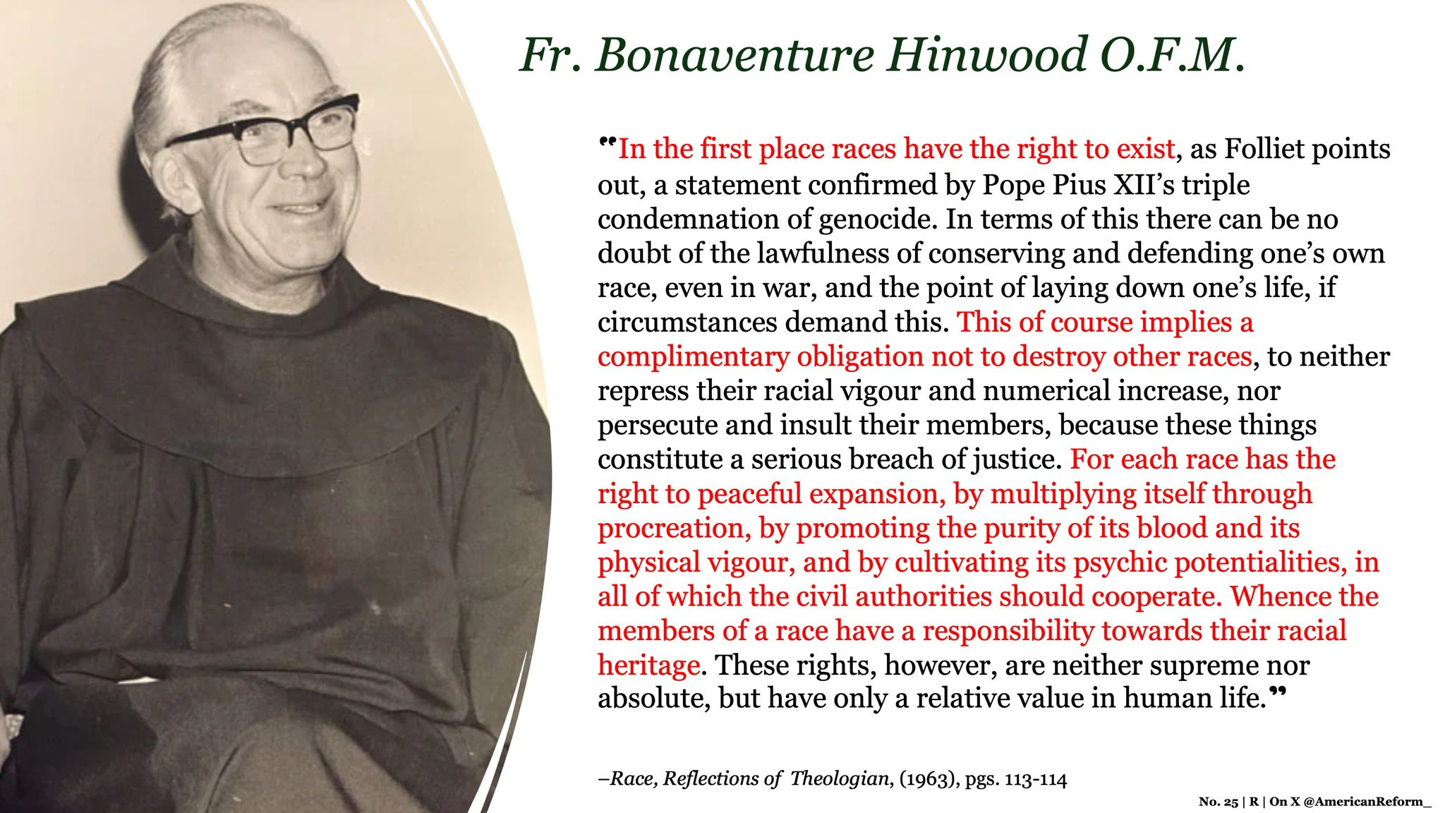 Noting, first, that in the most systematic study of race by a modern theologian, Fr. Bonaventure Hinwood plainly stated that “[E]ach race has the right to peaceful expansion, by multiplying itself through procreation, by promoting the purity of its blood and its physical vigor, and by cultivating its psychic potentialities, in all of which the civil authorities should cooperate. Whence the members of a race have a responsibility towards their racial heritage.” As shocking as this may be for modern ears, the White races along with Asians and Blacks have these same rights and responsibilities. Notice that the civil authority, the State, also has a role to play in the maintenance of racial harmony, which sometimes can mean legitimate separation.