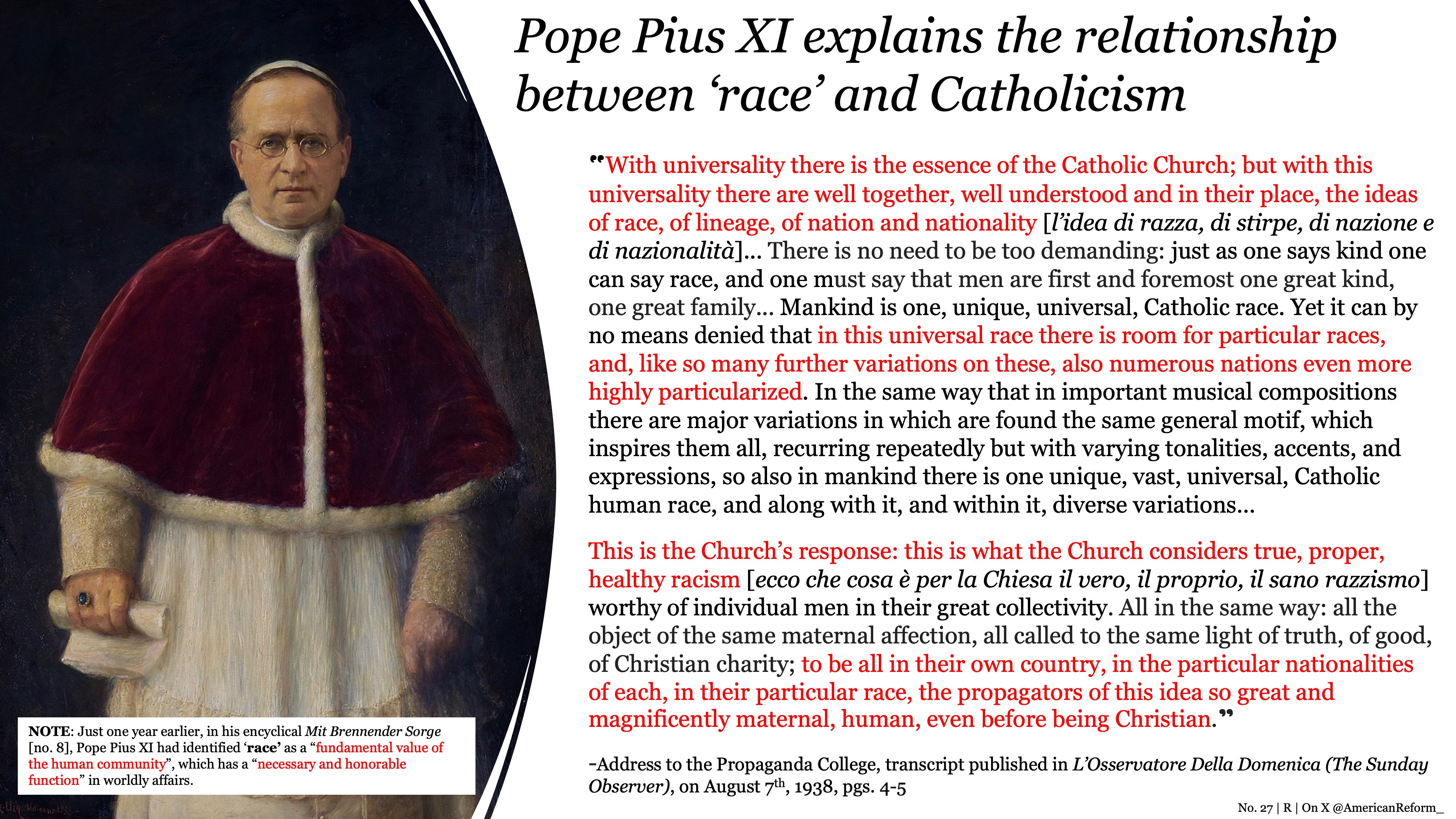 This is the Church’s response: this is what the Church considers true, proper, healthy racism [ecco che cosa è per la Chiesa il vero, il proprio, il sano razzismo] worthy of individual men in their great collectivity. All in the same way: all the object of the same maternal affection, all called to the same light of truth, of good, of Christian charity; to be all in their own country, in the particular nationalities of each, in their particular race, the propagators of this idea so great and magnificently maternal, human, even before being Christian.