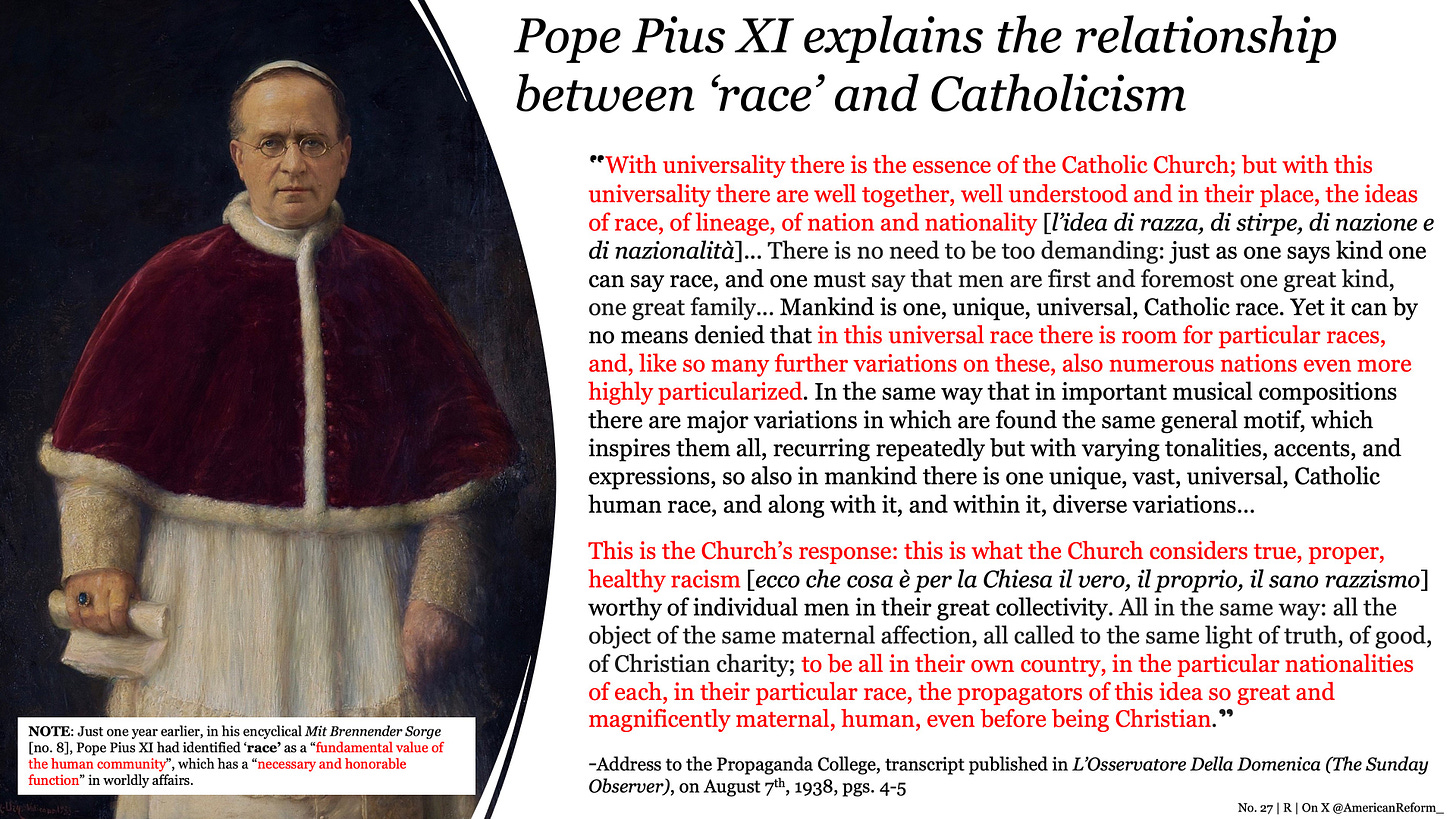 “The Whole America First thing, especially attaching it to race, is not reconcilable with Catholicism.” This was the statement confidently made at the 29:18 mark in the video by Kennedy Hall. The issue, which is immediately apparent, is Hall does not make a distinction between racialism, which is legitimate, and a position that is characterized by a radical or excessive racism. This is because, as will be outlined by Pope Pius XI, the program of Catholicism is that her universality does not come at the expense of particularity, far from it, rather it perfects the natural distinctions and groupings of men. It is a central doctrine of our religion that grace always builds upon nature, and there is a healthy racism, not only for Black and Asian races, but also for White races, whether they be American, British, Australian or Canadian. Recall that the same Pope, only one year before, had officially taught in his encyclical letter, Mit Brennender Sorge (MBS), no. 8, that race was a “fundamental value of the human community”, which plays a “necessary and honorable role” in human affairs. The Holy Father, contrasting the Catholic view against certain German racial excesses—that is, taking a good thing too far, raising it above a “standard level” to an “idolatrous level”—spoke plainly about this “healthy racism”. Noting that radical and excessive racism was condemned, in the 1938 address he would champion: