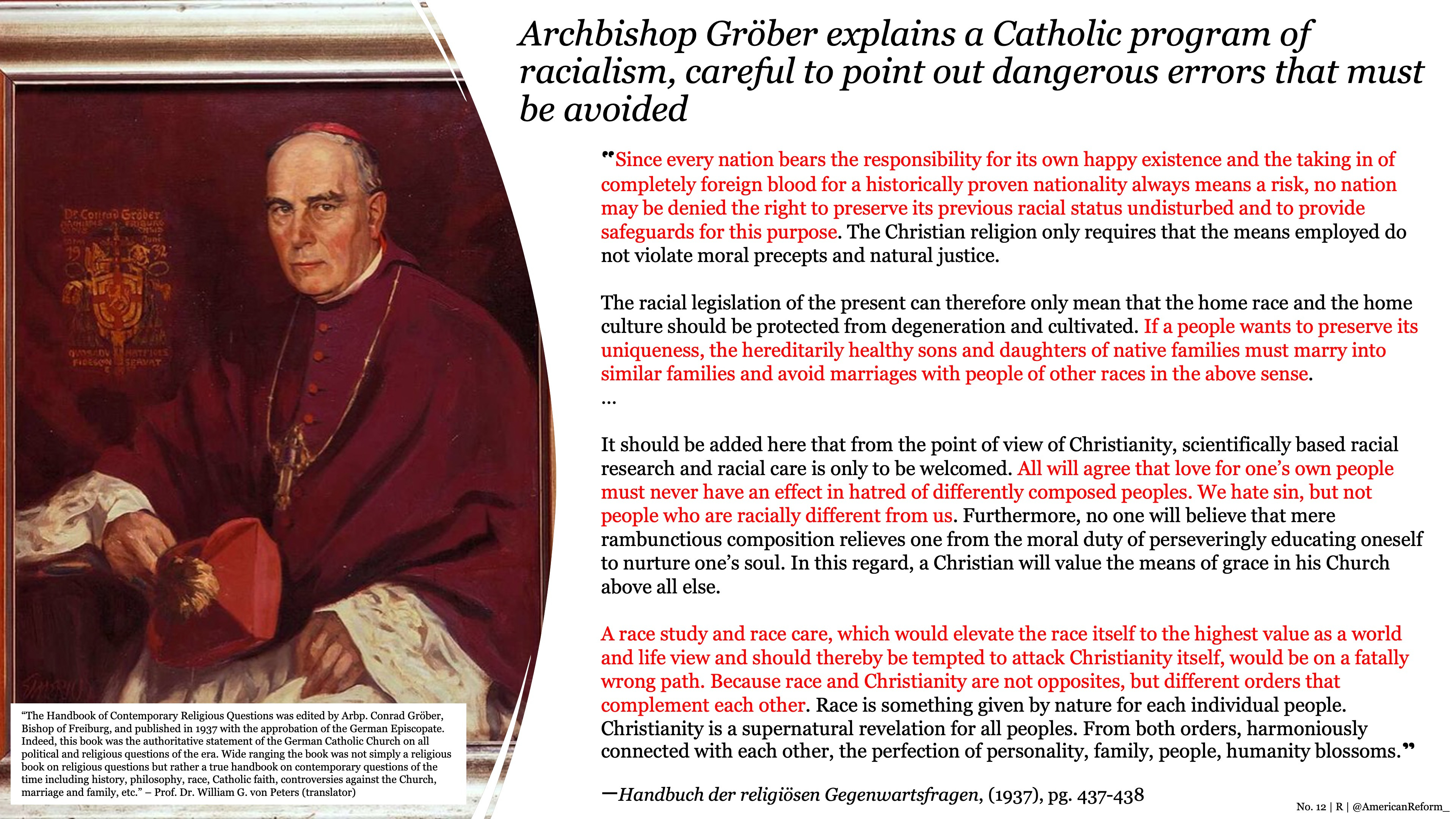 German prelates, where the racial problem was most acute, confirmed the same moderate view and affirmed the right to protect one’s blood, nation and race, of course using strictly moral means. Archbishop Conrad Gröber, who wrote the authoritative Handbook of Contemporary Religious Questions, with the approbation of the entire German hierarchy, witnessed to this in 1937 by saying: