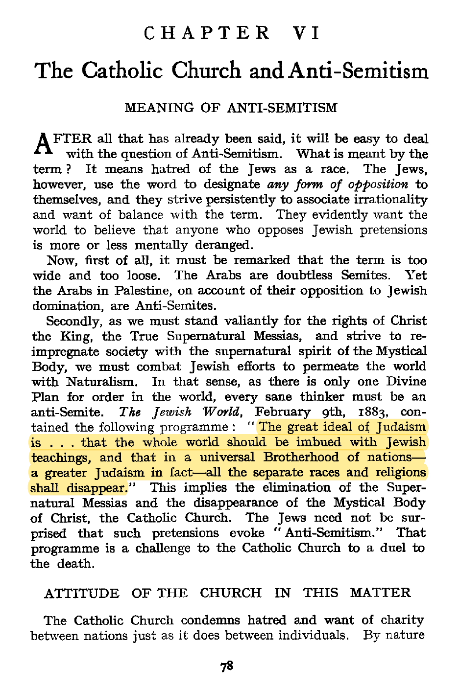Also, the Jewish program of naturalism, not “White supremacy”, the former which is committed to race-blindness, individualism and indiscriminate racial-mixing (save for Jews, of course), is what will usher in the man of perdition, the anti-Christ. Fr. Denis Fahey, C.S.Sp., who Mr. Hall quoted earlier in the discussion, warned in 1953 that “The Jewish World, February 9th, 1883, contained the following programme: ‘The great ideal of Judaism is... that the whole world should be imbued with Jewish teachings, and that in a universal Brotherhood of nations—a greater Judaism in fact— all the separate races and religions shall disappear.’”