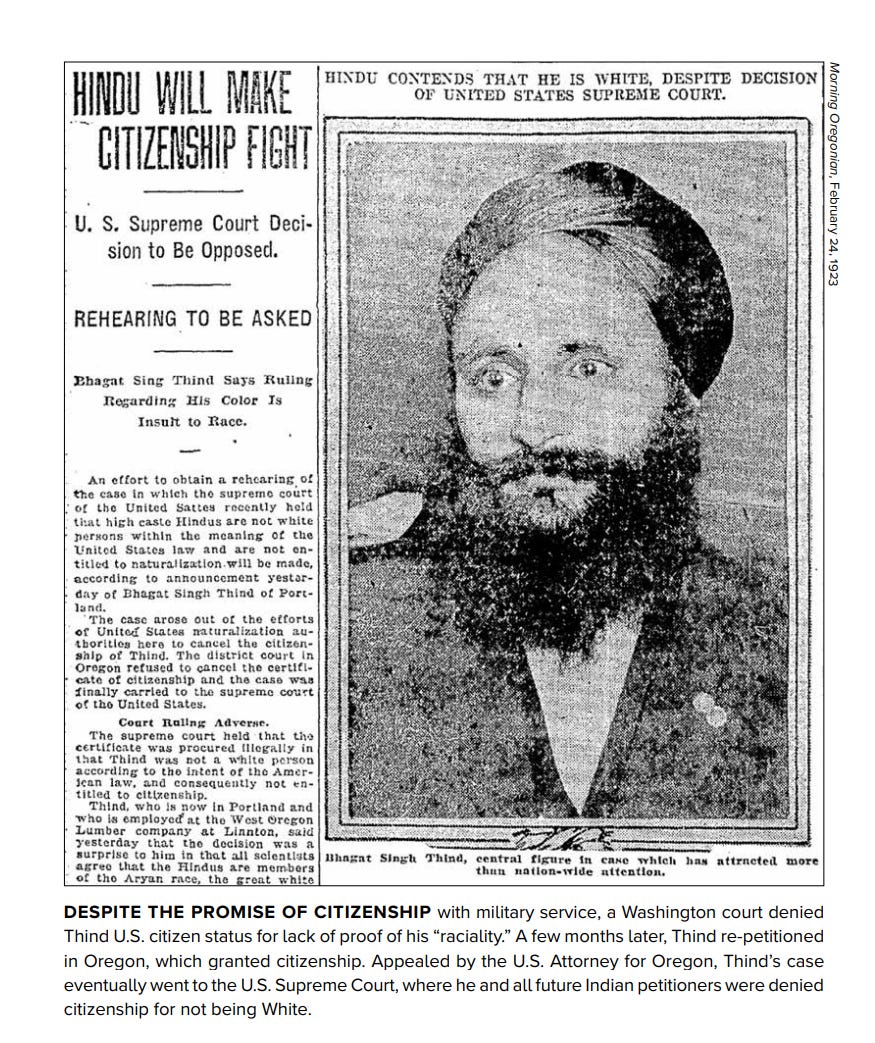 In the twentieth century, unsurprisingly, the White racial character of America was further cemented in law. In a famous Supreme Court ruling in 1923, “United States v. Bhagat Singh Thind”, the highest court in America ruled that the plaintiff, Bhagat Singh Thind, could not become a naturalized U.S. citizen because, as a Punjabi Sikh, he was not a “white person”. White, as had always been understood, was a racial identification exclusive to those of European ancestry which found its basis in lineage and blood, not merely the color of a man’s skin.