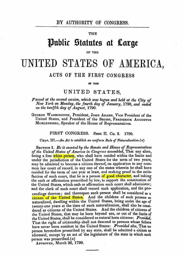 Making this point is not terribly difficult. The first immigration law passed by the United States, the Naturalization Act of 1790, explicitly limited citizenship to “free white person[s]”, merely codifying the original racial character of the country, along with prevailing public sentiment.