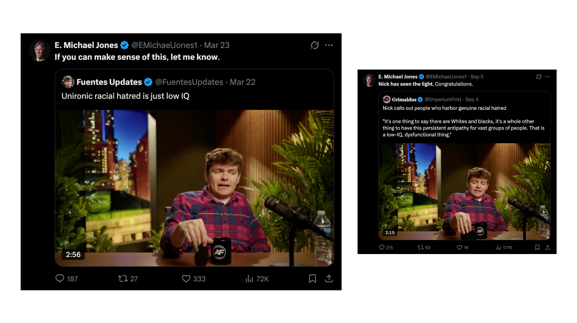 Dr. E. Michael Jones, for his part, has been refuted, time and time again on this very question. His many merits and storied career aside, he is not a serious thinker on questions of race, nor is he familiar with Catholic scholarship on the same. Most frustrating is his seeming allergy to scholastic philosophy, which results in many “category errors”, as he likes to say. The way he has interacted with a single clip of Nick Fuentes, which can be seen below, is emblematic.