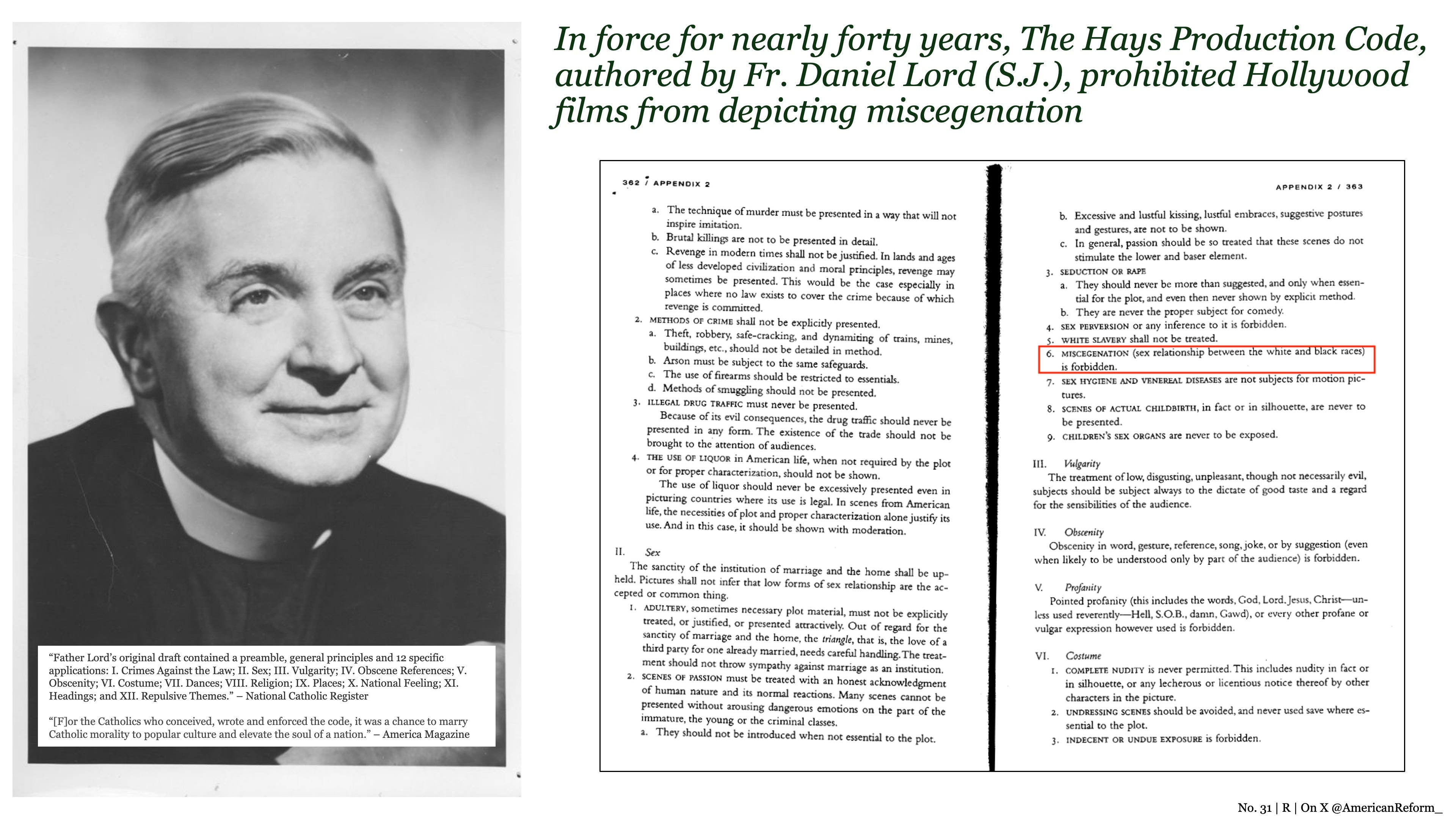 By mid-century, America was still a White country and racist, in a descriptive and non-pejorative sense. For example, the Hays Production Code, which was drafted and enforced by Catholics and lasting meaningfully into the 1950s, prohibited miscegenation from being shown on-screen, meaning sex relationships between the White and Black races. A perfectly sensible social regulation, which one would not be surprised to find in an Asian country like Japan, a European country like Sweden or an African country like Nigeria.