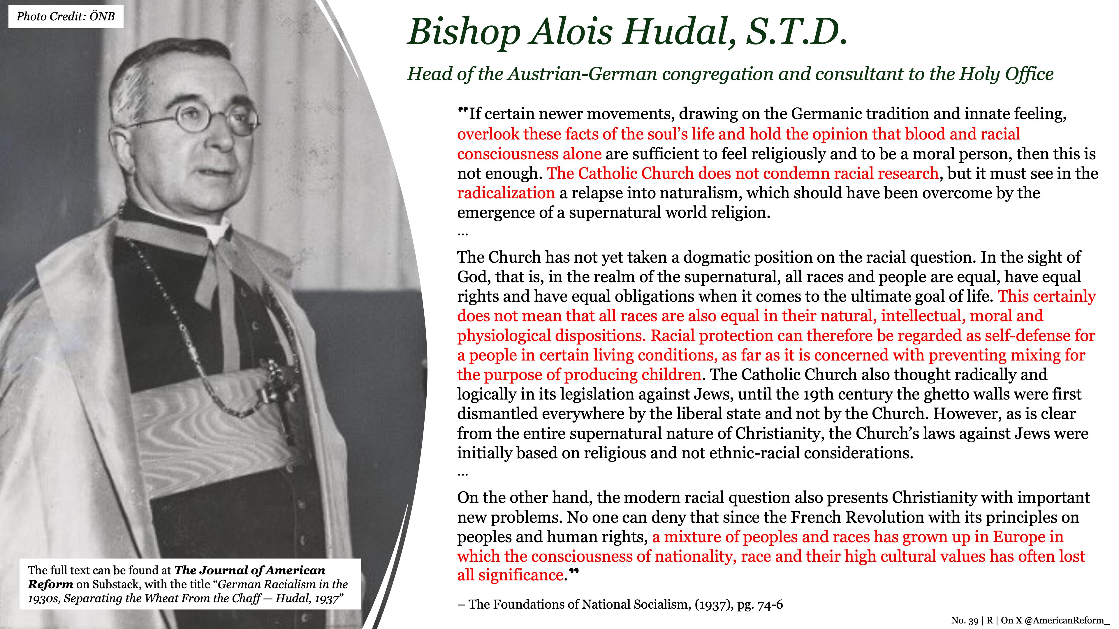 Bishop Alois Hudal, a consultant of the Holy Office and mentioned previously, similarly confirmed this in his brilliant 1937 study, The Foundations of National Socialism: