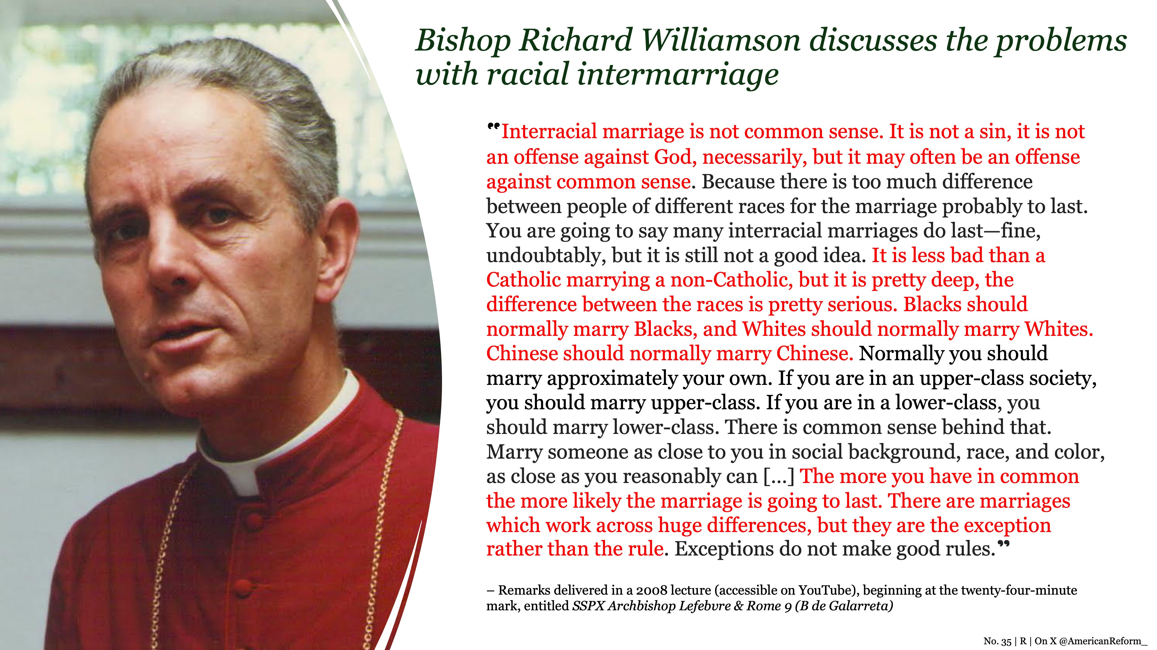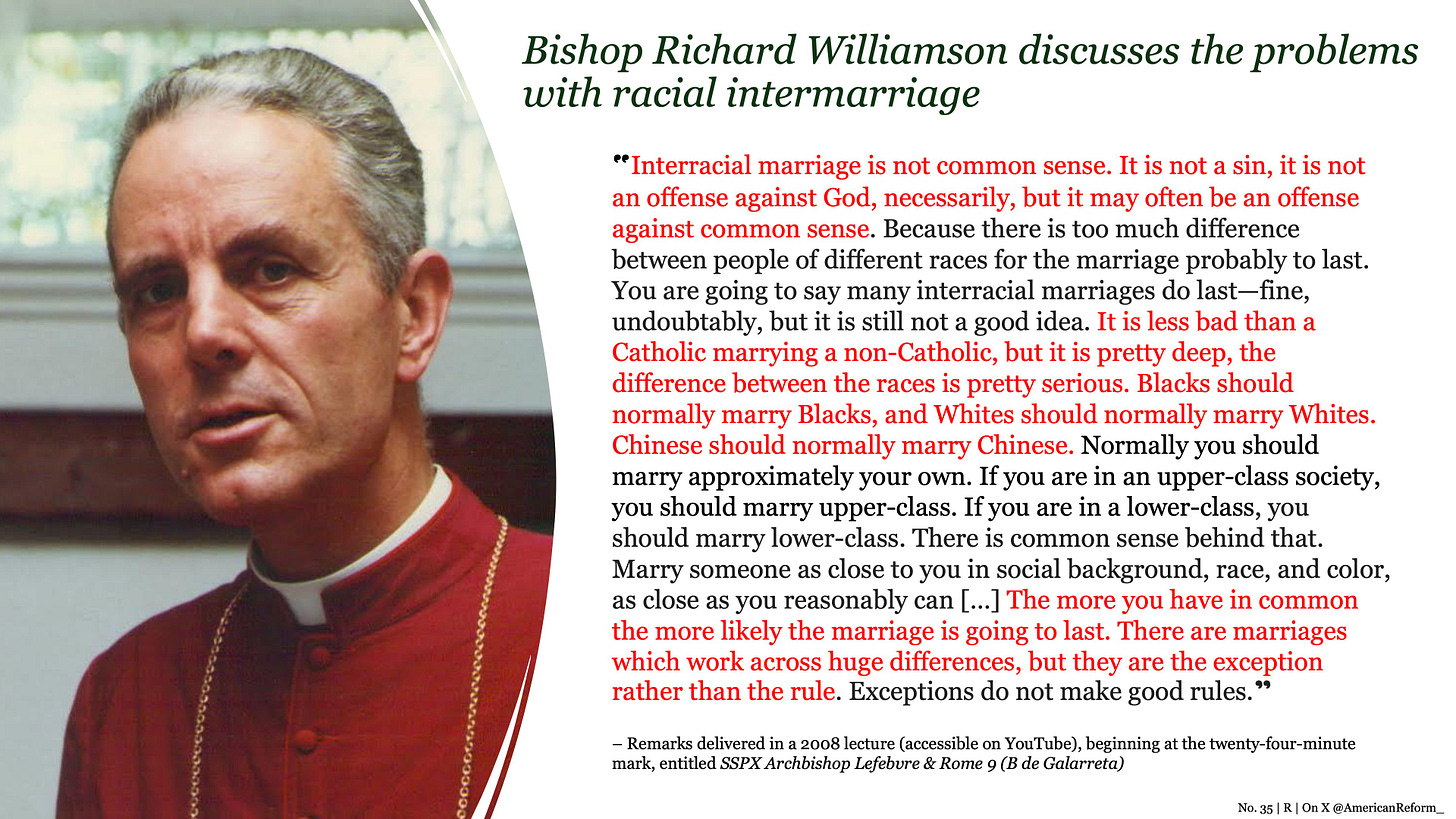 Since Vatican II, regrettably, few prelates have had the courage to speak about this issue with candor and if they do, it invariably comes with breathless equivocation, eager to prove their anti-racist bonafides. Bishop Richard Williamson, may God rest his soul, nearly alone, had the fortitude to reject this unique complex of White guilt, mapping out a balanced and noble loyalty to one’s kind. To the chagrin of many, he effectively challenged the modern, liberal taboos surrounding race, helping countless disaffected men, particularly in the younger generations, grapple with current racial problems.