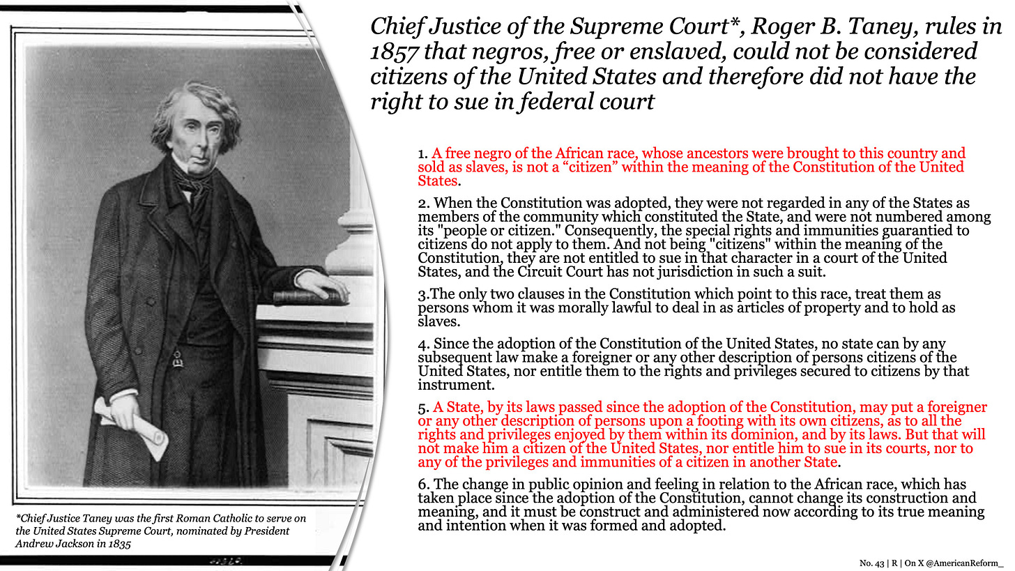 In 1857, the first Catholic Chief Justice of the Supreme Court, Roger B. Taney, ruled that negroes, free or enslaved, could not be considered citizens of the United States and therefore did not have the right to sue in federal court. Incidentally, this is not to say Black Americans are not citizens today, they are and cannot be denied the legal rights of other Americans, whether they be White or Asian. However, it is to demonstrate that the determination of citizenship, with its accompanying duties, first, followed by rights and privileges, belongs to the public authority, the State. As a matter of positive human law, it is fundamentally mutable, and must take into account changing circumstances. What does this mean? The right to citizenship is not absolute, nor is it a natural right, but once given could only be revoked for certain grave and proportionate reasons. That said, just like every other type of law, the common good is its essential directing principle.