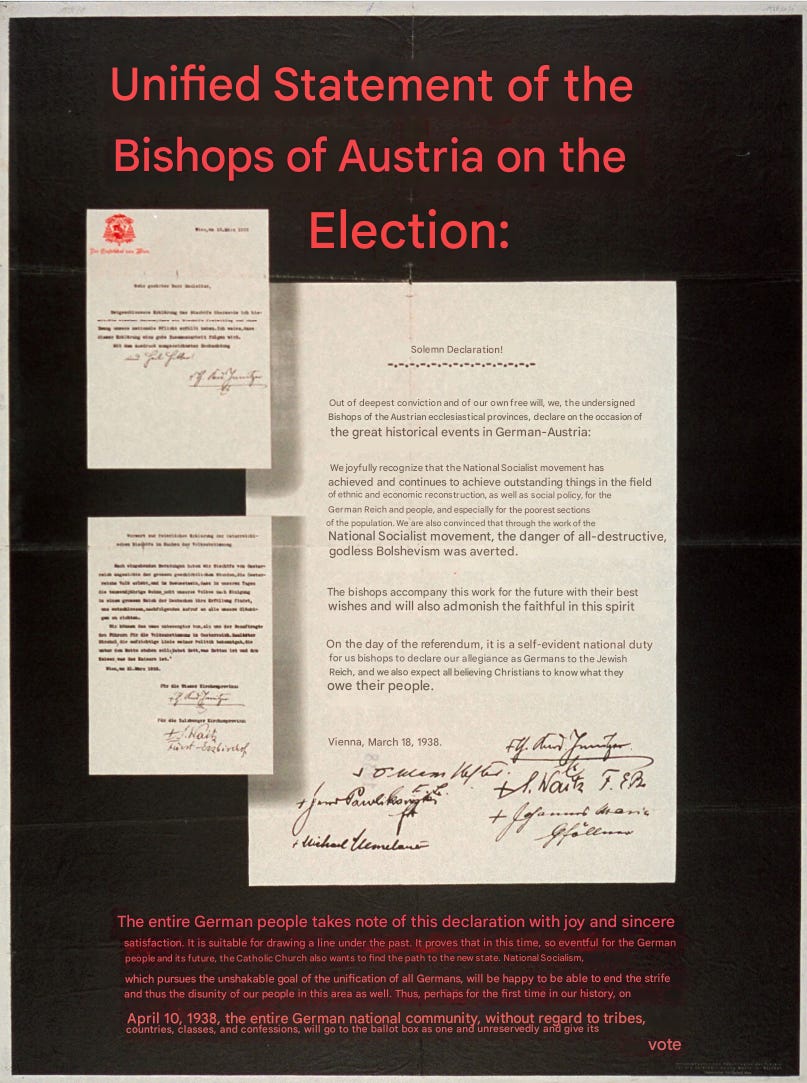 Already in our joint pastoral letter of February 7 of last year, we Austrian bishops declared about the National Socialist program: “Many program points allow for the most diverse interpretations and are therefore confusing. But written and oral statements by well-known leaders explain these program points in such a way that their extraordinarily hostile attitude toward the Catholic religion and the Catholic Church becomes clear to the whole world.”